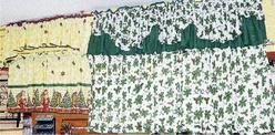 Two of the popular designs for Christmas-themed kitchen curtains that the seamstresses at Pablos will make for customers.