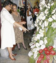 Wife of the governor general, Lady Hall (left), points to the arrangement titled, 'The First Miracle', during a floral festival held on the grounds of the St Margaret's Church, on November 15, as part of its 70th anniversary celebrations. Looking on is a member of the altar guild at the church, Sonia Dixon. - JIS