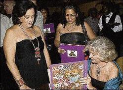 Kingston Restaurant Week guru Stephanie Scott (left), watches while author Susan Alexander signs a copy of her book and Bridget Walter awaits her turn at the launch of the author's latest work on paintings and sculpture titled 'Jamaican Journey' held at the Terra Nova All Suite Hotel on November 16. - Colin Hamilton/freelance photographer
