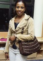 Georgia Gray sports a trendy beige jacket, with fringed sleeves and collar, which blends well with a brown, studded faux suede shoulder bag.- Contributed