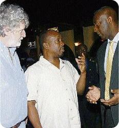 President of the Press Association of Jamaica (PAJ), Byron Buckley (centre), con-verses with Denver Frater (right), assistant commissioner of police in charge of Area One, at an induction ceremony for members of the western chapter of the PAJ held at the Twisted Kilt Lounge on Gloucester Avenue, Montego Bay, last Thursday night. Looking on is John Fisher Burns, a veteran journalist with The New York Times. Burns was the special guest of the PAJ during its week of celebrations. - Photo by Noel Thompson