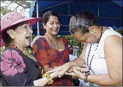 A palm-reading session? (From left) Honorary Consul of Equador to Jamaica, Clelia Barreta De Hunta, Tamara Hill and Joyce Delvaille entertain themselves at the American Women's Group meeting yesterday. - photos by Ricardo Makyn/Staff Photographer