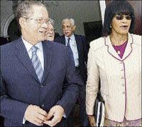 Prime Minister Bruce Golding and Opposition Leader Portia Simpson Miller exit the doors of Vale Royal, in St Andrew, on Wednesday, June 11. - Rudolph Brown/Chief Photographer