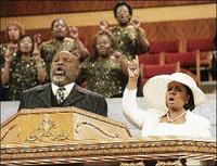 Bishop T.D. Jakes and his wife, Serita lead the congregation at the Potters House in singing a worship song during a May 2006 worship service at the church.
