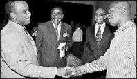 Winners handshake. The top performers in the National Commercial Bank (NCB) Auto Dealer Incentive Programme Ian Lyn (left) of Motor Sales and Services Ltd, and Lynvalle Hamilton of Auto Channel Ltd (right), congratulate each other at the bank's reception to thank its auto dealer partners. Stuart Reid (second left), NCB's branch manager and Dennis Cohen, deputy group managing director look on.