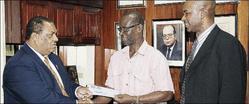 Michael Bernard (left), president of the Shipping Association of Jamaica (SAJ), presents a cheque to Desmond McKenzie, mayor of Kingston, to assist with the Kingston and St Andrew Corporation's charity events. Looking on is Roger Hinds, president-elect of the SAJ.