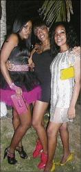 The Jackson girls, Bobbie (left) and Shakelia (centre) and their pal Renae Wong, make bold fashion statements at the Osmosis, City on the Bay party. - photos by Keisha Shakespeare-Blackmoreb>