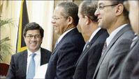 Luis Alberto Moreno (left), president of the Inter-American Development Bank (IDB), shakes hands with Prime Minister Bruce Golding while Audley Shaw, minister of finance and the public service and Don Wehby, minister without portfolio in the finance ministry, look on during the signing of a contract for US$329 Million in loans between the Government and the IDB at Jamaica House in St Andrew on January 19. - Rudolph Brown/Chief Photographer