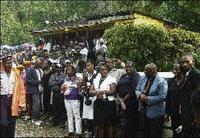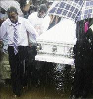 Towards the end of the service, the rain stops and there is brilliant, hot sunlight, allowing the Port Antonio Marching Band to start playing. Then the service ends. One by one the seven caskets, some colourfully decorated, are removed. Pall-bearers, men and women, relatives and strangers, carry them through the water-logged football field to the hearses. People rush through the water and the muck to get a glimpse. It's a heart-rending sight. And the band starts to play, to lead the throng to the grave sites.