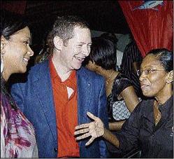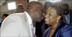 Howard McIntosh plants a kiss on the cheek of Information, Culture, Youth and Sports Minister, Olivia Grange, at the Fellowship Tabernacle in St Andrew yesterday. The occasion was the launch Reggae Month. - Norman Grindley/acting Photography editor
