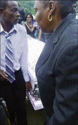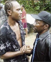 Cheer up my brother. Leon Palmer (right), who lost his son, brother and common-law wife, is being consoled by a friend.