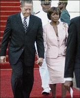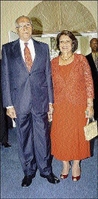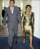 Hand in hand, Prime Minister Bruce Golding and wife Lorna Golding head for the platform.