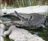 A crocodile lounges in a man-made swamp at the zoo while the other shows off its sharp teeth.