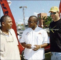 Ian Lyn (centre), Motor Sales and Service's brand sales and marketing manager, has the attention of Montego Bay businessman Danny DePass (left), while Doug Gore, 2007 Caribbean Champion race-car driver, listens. They were at the Scotiabank Carmania show at the Urban Development Corporation's 'Dump Up' Beach in Montego Bay, on February 21 and 22. - Photos by Noel Thompson