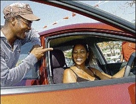 Returning resident Sandra Duncan is tickled by Steve Parker's antics as she gets a feel of one of ATL Motors' 2009 Honda models at the Scotiabank Carmania show.