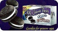 Finally, watching your weight doesn't have to be boring. Thanks to Nambisco. the 100-calorie pack of Oreo Cakesters. Now dieters can enjoy three rich, moist chocolate cakes, filled with that delectable Oreo creme. Yeah, the goodies for grown-ups.