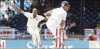 West Indies fast bowler Daren Powell (left) appeals unsuccessfully for a caught behind decision against England batsman Owais Shah, during yesterday's opening day of the fifth and final Test, at Queen's Park Oval, Trinidad and Tobago. Shah retired hurt for 29 as England closed the day at 258 for two. - Dellmar photo