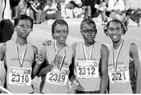 Manchester High School's 4x800 quartet pose for the camera after winning the event at the 33rd staging of the Gibson Relays. They are (from left) Kimberly Brown, Neisha Morgan, Sharlene Brown and Natoya Goule. - Anthony Minott/Freelance Photographer