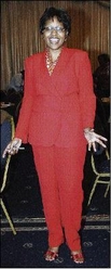 Left: With such poise, elegance and, of course, a pretty face, Debra Lopez is stunning in this hot, red suit. To tone things down, she wore beige pumps for contrast. Right: Vanessa Miller definitely looks spectacular in her red pants suit with complementary scarf. Her body language says 'I have the right attitude!'