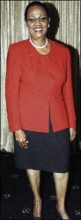 Left: April Brown looks fabulous from head to toe. In cool tones of light red, pink and white, she is every inch the corporate lady out to a power lunch. Right:Carole Fullerton also chose red, with the strong contrast of black to make her fashion statement at the Kiwanis Club of New Kingston's Women of Excellence champagne luncheon. It was held on Friday at The Jamaica Pegasus.
