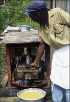 Omroy Anderson operating the extractor that squeezes the juice from the grated cassava.