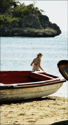 It was clear that I would get nowehere with him around, so, quite annoyed, I went outside with my drink. I stood on the beach looking out to sea. There were only about five men loitering near a fishing boat on shore, close to me, gawking at the Caucasian women now prancing around in the water.