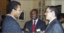 Jamaican-born entrepreneur Wilfred Emmanuel-Jones (left) engages Trevor McClymont (centre), and newly appointed Jamaican Trade Commissioner, Lawrence Jones, at the launch of the Jamaica Enterprise Network United Kingdom (JEN-UK) at the Jamaican High Commission in London recently. - Contributed photos