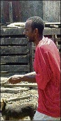 Right: Lloyd McKay in an animated discussion with The Gleaner in front of the shack in which he stores his pigs' feed. - photos by Paul Williams