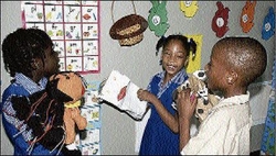 Shanya Connell (left), Shannon Allen (centre) and Peter-John Reid, all of Barracks Road Primary School, St James, are having fun as they prepare to take part in the puppet competition at John Rollins Success Primary School's reading marathon. - FILE