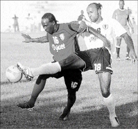 Bull Bay's Richard Brown (right) moves the ball away from August Town's Joshimar Campbell, while his teammate Andre Morris looks on during their KSAFA/Claro Super League match at the Edward Seaga Sports Complex recently