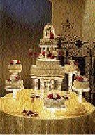 The bridesmaids were dressed in red-and-gold gowns, designed by Patricia Barnes, while the groomsmen wore black tuxedos with red-and-gold vests.