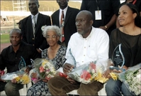 Former Olympians Raymond Stewart (seated at left) and Beverly McDonald (right), along with coach Fitz Coleman (second right) and track official Carol Cuffley hold their awards in recognition of their contribution to the Inter-secondary Schools Sports Association/GraceKennedy Boys and Girls' Athletic Championships at the National Stadium on Friday. - photos by Ian Allen/Staff Photographer
