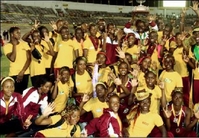 Holmwood Technical High School athletes celebrate their seventh straight victory in the girls' section after the 99th staging of the Inter-secondary Schools Sports Association/GraceKennedy Boys and Girls' Athletic Championships at the National Stadium on Saturday.