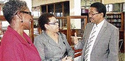 Grantley Stephenson, chairman and chief executive officer of Kingston Wharves Limited welcomes Mayor of Mandeville Brenda Ramsay (centre) and Phyllis McFarlane of the Manchester Victims Support Unit to the opening of the Shipping Association of Jamaica's 70th Anniversary Exhibition of Photographs and Artefacts last Friday. Mr Stephenson was the guest speaker at the function.