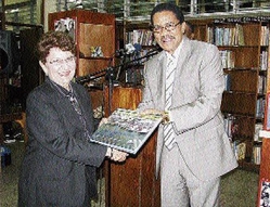 Grantley Stephenson, chairman and chief executive officer of Kingston Wharves Limited, presents a copy of History of the Shipping Association of Jamaica (SAJ), to Jean Anderson, president of the Lay Magistrates Association of Manchester after the opening of the SAJ's 70th anniversary exhibition of photographs and artefacts, held at the Manchester Parish Library last Friday.