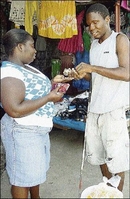 "Bag juice, bag juice! Bag juice man, sell mi a bag juice," a short, plump woman shouted out to him."Yes mi hear yu," the man replied as he approached her.