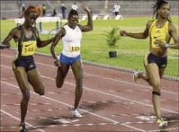 Olympic 400 metres hurdles champion, Melaine Walker (centre) of MVP Track Club, crossing the line in third in the women's 400m at last Saturday's Utech Classic at the National Stadium.
