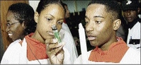 Dayna Nelson and Marlon Samuda check the lighter fuel at the Anglican conference at the National Arena on Sunday.
