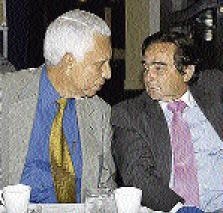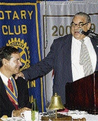 Christopher Issa (left), president of the Rotary Club of Kingston, is regaled with tales of his father's past by fellow Rotarian Robert MacMillan at the Kingston club's International Day luncheon at The Jamaica Pegasus hotel yesterday. - Colin Hamilton/Freelance Photographer