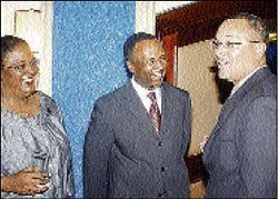 (4) - Christopher Barnes (right), deputy managing director of The Gleaner Company, jokes with Wayne Wray, president of First Global Bank, and Mia Mottley, opposition leader in Barbados at Wednesday's First Global Vision Awards dinner, held at The Jamaica Pegasus hotel in New Kingston