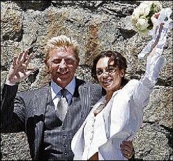 (2) - German tennis legend Boris Becker (left) and his wife, Sharlely 'Lilly' Kerssenberg, wave to photographers after their marriage at the civil registry office in the Segantini Museum in St Moritz, Switzerland, yesterday. The bride's bouquet was about the only traditional accessory usually seen at a wedding.