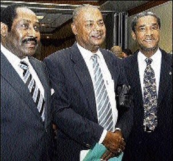 (6) - Captain Horace Burrell (left), Michael Ricketts (centre) and Ambassador A.B. Stewart Stephenson listen attentively to the proceedings at Tuesday's Digicel Premier League and National Under-21 awards ceremony.