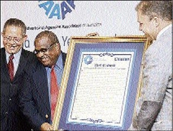 (1) - Arnold J. Foote (right), president of the Advertising Agencies Association of Jamaica, presents the award for Media Personality of the Year to Lloyd B. Smith. Looking on at left is Prime Minister Bruce Golding at the AAAJ Media Awards 2009 at Knutsford Court Hotel, New Kingston, on Wednesday.