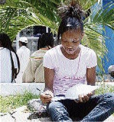Melisa McLean finds a spot to write on the Sam Sharpe Square cobblestone.
