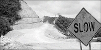 This sign to tell drivers to take caution, as construction is in progress on the Mount Rosser leg of Highway 2000, also points, , to hold-ups in the completion of the work.