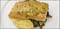 Salmon with a mustard-parsley glaze, collard greens with red onions and bacon, mashed potatoes and rutabaga.- MCT photos