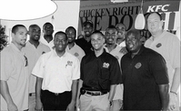 Members of the Jamaica basketball squad and sponsors (from left): Chaz Carr, Andre Smith, Rohan Garwood - area manager for KFC, Ricardo Alliman, Christopher Walker, Kymani Friend, Rohan Halsal - marketing coordinator, Mike Rodger, Samardo Samuels, Sam Vincent - head coach and Paul Mokeski - assistant coach. - Contributed