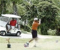 Veteran golfer Gordon Hutchinson of Advantage General tees off in his 2-0 match-play showdown against Burt Rodney in Sunday's Jamaica Money Market Brokers Golf Cup at the Cinnamon Hill Golf Course in Montego Bay. - photo by Adrian Frater