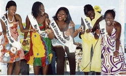 Miss Jamaica Festival Queen contestants (from left) Lanisia Rhoden, Tamara Dickens, Sadeiga Grant, Alicia-Ann McKenzie and Crystal Blake help entertain guests during their visit to Dolphin Cove in Ocho Rios last Saturday. - Contributed Photos