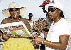 Alicia Christian (left), an optical dispenser employed to Imperial Optical in May Pen, Clarendon, 'looks' really beautiful as she checks out The Sunday Gleaner's front page at the 11th annual staging of the Little Ochie Seafood Carnival in Alligator Pond, Manchester, on Sunday. Sharing information with her is Veneisha Cookhorn, advertising sales representative of The Gleaner, Western Bureau. - Photo by Noel Thompson